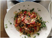 Chilispaghetti mit Gemüse und scharfer sizilianischer Salami
